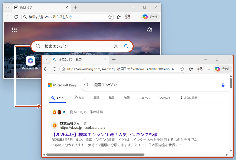 Microsoft Edge のホーム画面で2箇所の検索エンジンを変更する部分を説明している画像