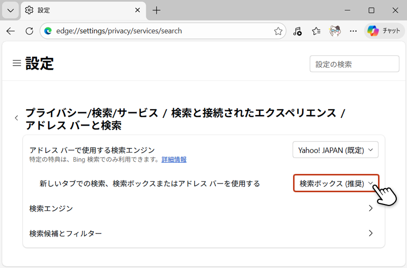 新しいタブの検索、検索ボックまたはアドレスバーを使用する」の右側にあるプルダウンをクリック。