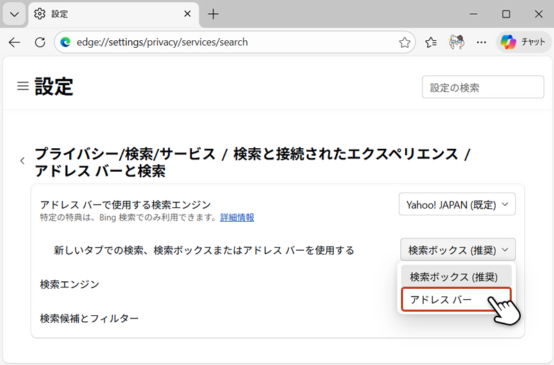 Edgeの設定画面の「アドレスバーで使用する検索エンジン」項目の右側にあるプルダウンから「Yahoo!JAPAN」を選択している画像